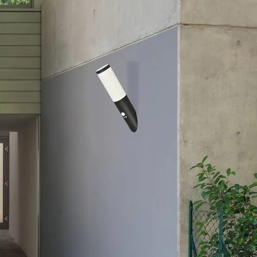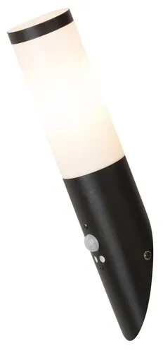 Modern megjelenésű kültéri falikar beépített mozgásérzékelő szenzorral, 1 db foglalattal, döntött talapzatú kivitelben. Matt fekete színű rozsdamentes acélból és műanyagból készített lámpatest, IP44-es, azaz por és fröccsenő víz elleni védelemmel. A lámpatest E27-es foglalatkialakítású, max. 25W teljesítményű, kizárólag energiatakarékos fényforrással használható. Elhelyezésekor vegye figyelembe, hogy a szenzor 100 fokos szögben, max. 5 méter távolságban érzékeli a mozgást.