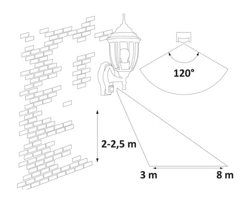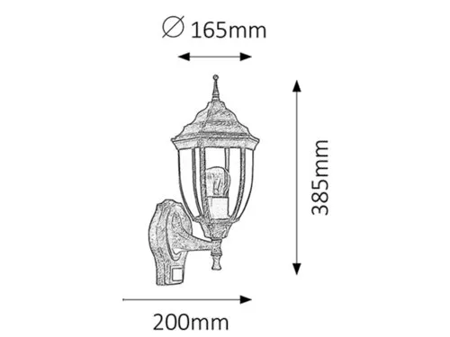 Klasszikus megjelenésű kültéri fali lámpa 1 db foglalattal, beépített mozgásérzékelővel, felfelé irányított búrával. 38,5 cm magas, 20 cm a faltól mért távolsága, antik arany színű fém lámpatest és víztiszta üvegbetétes lámpabúra, IP43-as védettséggel. A lámpatest E27-es foglalatú, max. 60W teljesítményű energiatakarékos fényforrással is használható. A lámpatest elhelyezésekor vegye figyelembe, hogy a szenzor 120 fokos szögben, max. 8 méter távolságban érzékeli a mozgást.