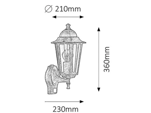 Klasszikus megjelenésű kültéri falikar 1 db foglalattal, beépített mozgásérzékelővel, felső állású kivitelben. 36 cm magas, 23 cm kinyúlású, antik arany színű fém lámpatest és víztiszta üvegbetétes lámpabúra, IP43-as védettséggel. A lámpatest E-27-es foglalatú, max. 60W teljesítményű energiatakarékos fényforrással is használható. A lámpatest elhelyezésekor vegye figyelembe, hogy a szenzor 120 fokos szögben, max. 8 méter távolságban érzékeli a mozgást.