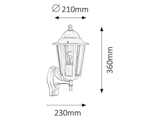 Klasszikus megjelenésű kültéri falikar 1 db foglalattal, beépített mozgásérzékelővel, felső állású kivitelben. 36 cm magas, 23 cm kinyúlású, fehér színű fém lámpatest és víztiszta üvegbetétes lámpabúra, IP43-as védettséggel. A lámpatest E-27-es foglalatú, max. 60W teljesítményű energiatakarékos fényforrással is használható. A lámpatest elhelyezésekor vegye figyelembe, hogy a szenzor 120 fokos szögben, max. 8 méter távolságban érzékeli a mozgást.