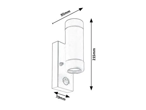 A Medina mozgásérzékelős kültéri fali lámpa dizájnja a minimál stílus jegyében született. A műanyagból készült, matt fehér lámpát átlátszó búra egészíti ki, a lámpa felfelé és lefelé világít. Jó szolgálatot tehet a külső házfalon vagy a teraszon, ahol kisebb tér fókuszáltabb megvilágítására van szükség. Két darab, legfeljebb 10 W teljesítményű, energiatakarékos fényforrással használható, a foglalat típusa GU10. A lámpát fényforrás nélkül szállítjuk. A Medina fali lámpa méretei a következők: magassága 215 mm, szélessége 70 mm, a lámpa faltól való távolsága 95 mm. A mozgásérzékelő 8 méter távolságból, 90°-os látószögben érzékeli a mozgást. A kültéri lámpa IP44-es védettséggel rendelkezik, azaz legfeljebb 1 mm átmérőjű tárgyak behatolása ellen, valamint bármilyen irányból fröccsenő víz ellen védett.
