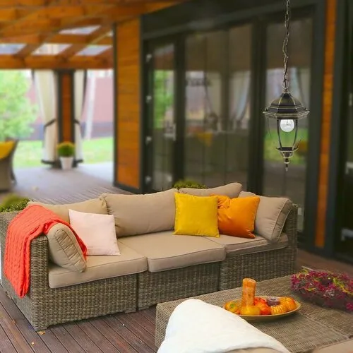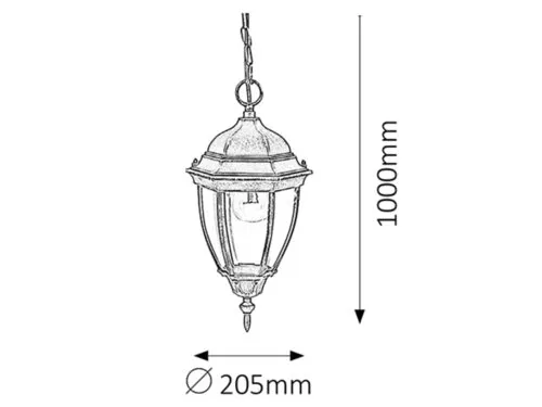 Klasszikus megjelenésű kültéri függeszték 1 db foglalattal. 100 cm lelógású, 20,5 cm átmérőjű, antik arany színű fém lámpatest és víztiszta üvegbetétes lámpabúra, IP44-es, azaz fröccsenő víz és por elleni védelemmel. A lámpatest E27-es foglalatú, max. 100W teljesítményű fényforrással használható.
