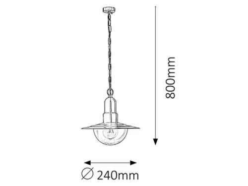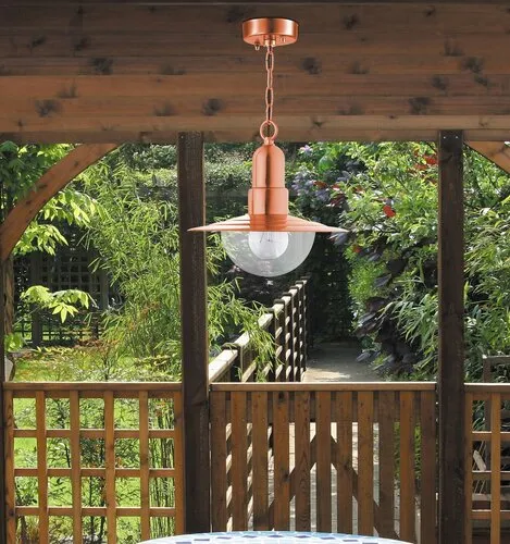Időtlen megjelenésű kültéri függeszték 1 db foglalattal, UV sugárzásnak ellenálló kivitelben. 80 cm lelógású, 24 cm ernyőátmérőjű, réz színű fémből készített lámpatest áttetsző műanyag lámpabúrával, IP44-es, azaz fröccsenő víz és por elleni védelemmel. A függeszték E27-es foglalatú, max. 60W teljesítményű energiatakarékos fényforrással is használható.