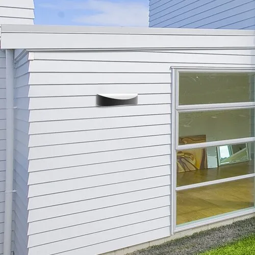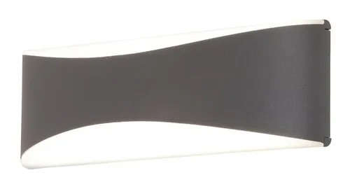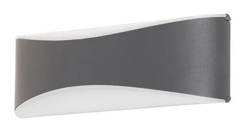 Modern megjelenésű kültéri fali lámpa beépített LED fényforrással. 23 cm széles, 5 cm kinyúlású, antracit szürke fém ház és műanyag lámpabúra, IP65-ös védettséggel. A beépített LED fényforrás 10W teljesítmény mellett 1000 lumenes fényerőt és 4000 Kelvines, természetes fehér színű fényt biztosít. 5 év garanciával. A lámpatestben a fényforrás nem cserélhető!