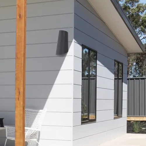 Modern megjelenésű kültéri fali lámpa beépített LED fényforrással. 17,5 cm magas, 5 cm kinyúlású, antracit szürke fém ház és műanyag lámpabúra, IP65-ös védettséggel. A beépített LED fényforrás 11W teljesítmény mellett 1200 lumenes fényerőt és 4000 Kelvines, azaz természetes fehér színű fényt biztosít. 5 év garanciával. A lámpatestben a fényforrás nem cserélhető!