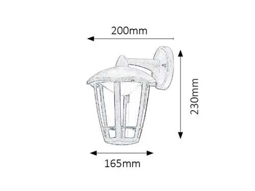 Mediterrán stílusú, lefelé irányított búrával ellátott kültéri fali lámpa beépített energiatakarékos LED fényforrással. 23 cm magas, 20 cm kinyúlású, matt fekete színű műanyag lámpatest műanyag lámpabúrával, IP44-es, azaz por és fröccsenő víz elleni védelemmel. A beépített LED fényforrás 8W teljesítmény mellett 500 lumenes fényerőt, valamint 3000 Kelvines, melegfehér színű fényt biztosít. 5 év garanciával. A lámpatestbe beépített fényforrás nem cserélhető.