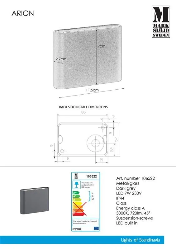 MARKSLÖJD ARION Kültéri fali lámpa LED 6W meleg fehér 720lm szürke