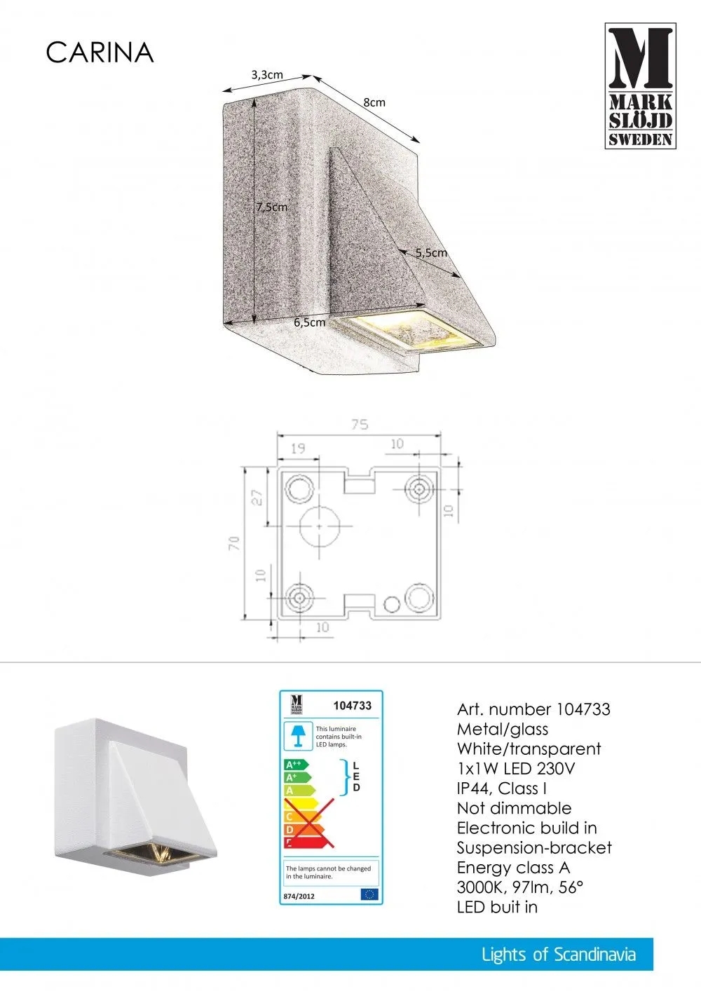 MARKSLÖJD CARINA Kültéri fali lámpa LED 1W meleg fehér 97lm fehér
