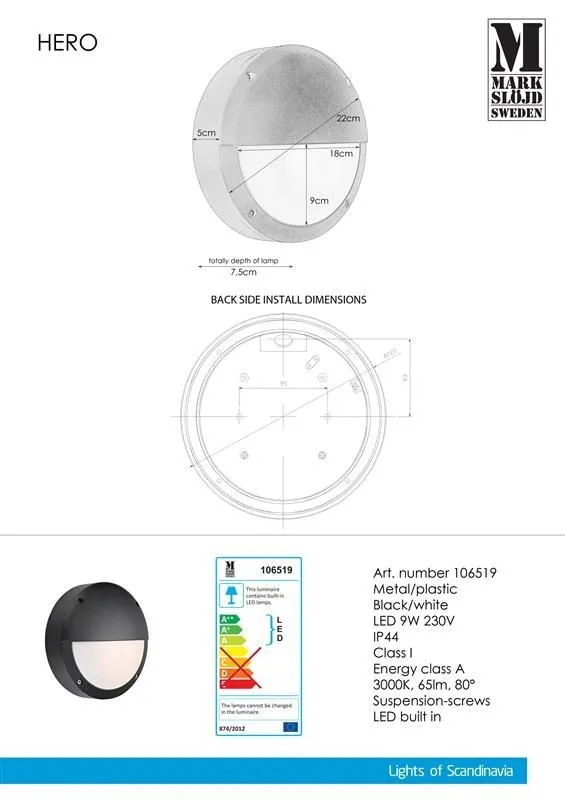 MARKSLÖJD HERO Kültéri fali lámpa LED 9W meleg fehér 650lm fekete