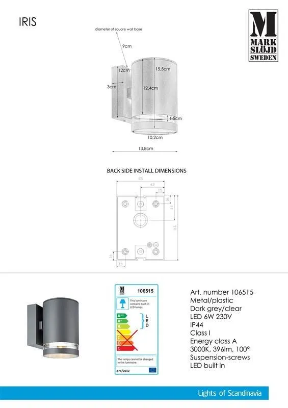 MARKSLÖJD IRIS Kültéri fali lámpa LED 6W meleg fehér 396lm szürke