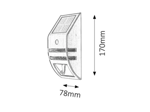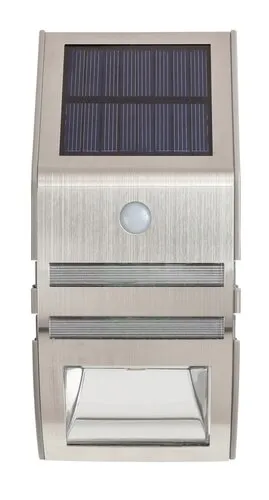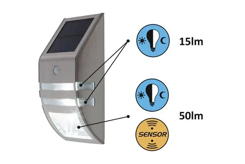 Modern megjelenésű kültéri, napelemes lámpa beépített energiatakarékos LED fényforrásokkal, beépített mozgásérzékelővel és akkumulátorral. 7,8 cm széles, 17 cm magas, rozsdamentes acél színű fém lámpatest és áttetsző műanyag lámpabúrák, IP44-es, azaz fröccsenő víz és por elleni védelemmel. A lámpában két LED izzó található, aminek köszönhetően akár még energiatakarékosabban is üzemelhető, választhatunk, hogy csak az egyik vagy mindkét fényforrást használjuk. Beépített LED fényforrások 0,15 és 0,5W teljesítmény mellett 15 és 50 lumenes fényerőt és 6000 Kelvines, hidegfehér színű fényt biztosítanak. 5 év garanciával! A beépített fényforrások nem cserélhetők! A lámpatest elhelyezésekor vegye figyelembe, hogy a szenzor 90 fokos szögben, max. 5 méter távolságban érzékeli a mozgást.
