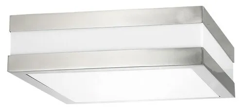 Modern megjelenésű kültéri mennyezeti lámpa 2 darab foglalattal, UV sugárzásnak ellenálló kivitelben, IP44-es, azaz fröccsenő víz elleni védettséget biztosít. 28.5 cm széles, rozsdamentes acél színű fémből és fehér színű műanyagból készített lámpatest E27-es foglalattal. Kizárólag energiatakarékos fényforrásokkal működtethető, max. 2x 11W teljesítményű halogén vagy LED izzókkal.