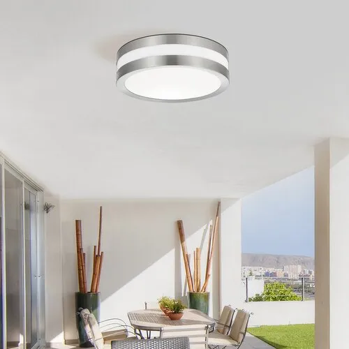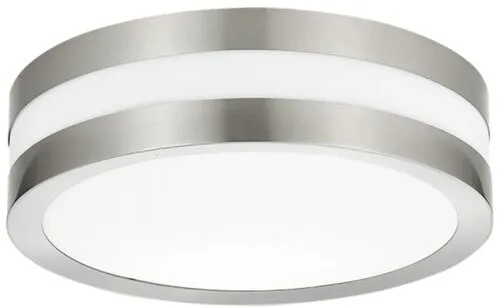 Modern megjelenésű kültéri mennyezeti lámpa 2 darab foglalattal, UV sugárzásnak ellenálló kivitelben, IP44-es, azaz fröccsenő víz elleni védettséggel. 28.5 cm átmérőjű, rozsdamentes acél színű fémből és fehér színű műanyagból készített lámpatest, E27-es foglalattal. Kizárólag energiatakarékos fényforrásokkal működtethető, max. 2x 11W teljesítményű halogén vagy LED izzókkal.